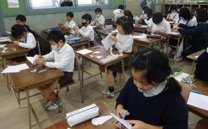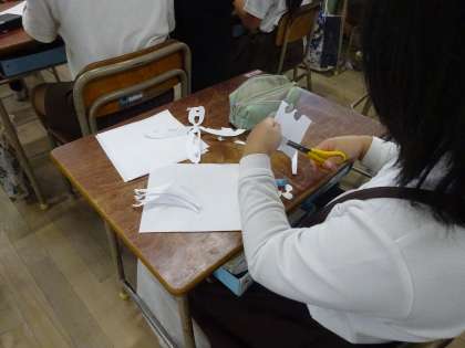 2年生は図画工作科「パフェの下にしくレースペーパーを作ろう」です。版画用紙を四角形や三角形に折って、はさみで切り込みを入れます。破れないようにそっと開くと、素敵なレース模様が出来上がります。来月の作品展で立体作品とともに展示予定です。お楽しみに!