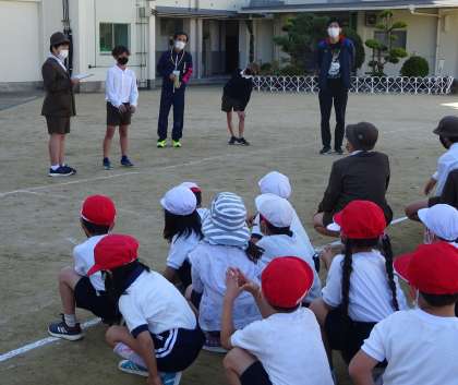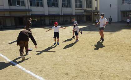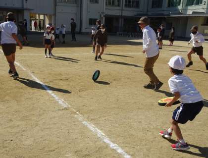 今週は「6年生と遊ぼう週間」です。4か月後に卒業する6年生との思い出作りとして、一学年ずつ毎日日替わりで、15分休みに6年生と一緒に遊びます。1日目の今日は、1年生と6年生のドッジビーでした。1年生にドッジビーを渡して投げさせてあげる6年生や、かっこよくキャッチする6年生を見て”すごい!!”とびっくりしている1年生。とても和やかな時間でした。