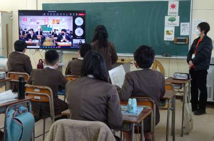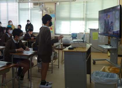 今日の6年生の外国語の時間は、桃谷中学校の2年生とオンラインでつないでの学習です。それぞれが事前に考えていた質問を英語で伝え合います。6年生の子どもたちは、中学校生活のことを、一人ずつ質問しました。中学生からの質問にも、英語でしっかり答えていました。どちらも緊張している様子でしたが、楽しい交流の時間がもてました。