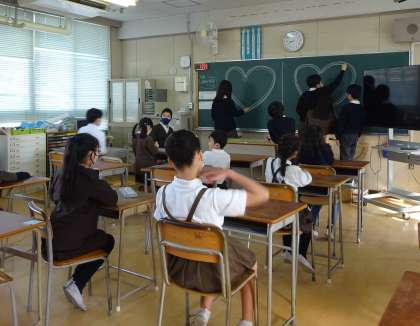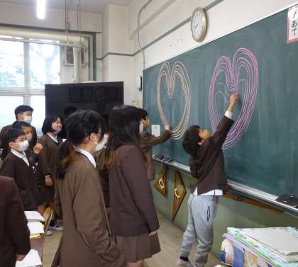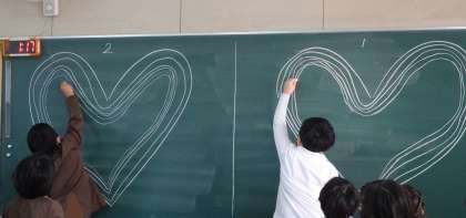 今日の児童集会は「ハートリレー」です。黒板に描いた大きなハートの中に、ハートを描き入れていきます。線と線が重ならないように、時間内(3分間)にできるだけ多くのハートを描きこんだ班の勝ちです。どの班の子どもたちも、息を飲んで見守っていました。