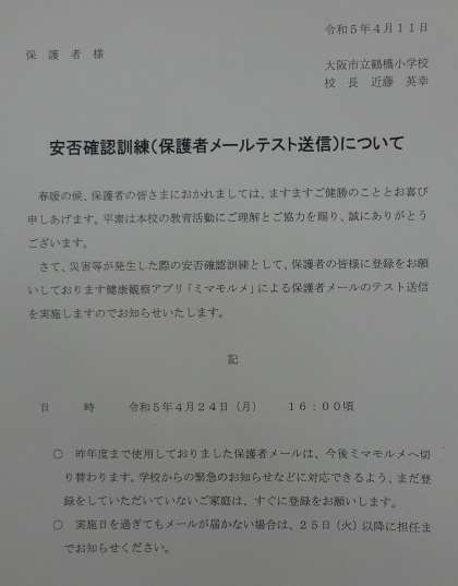 本日、16時に健康観察アプリ「ミマモルメ」による、保護者メールのテスト送信を実施いたします。災害等が発生した際の安否確認の訓練となっておりますので、メールを受信されましたら、アンケートに答えていただきお子さまの安否についてお知らせください。本日中にメールが届かないご家庭がありましたら、明日以降、学校までお知らせください。