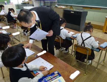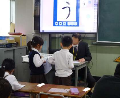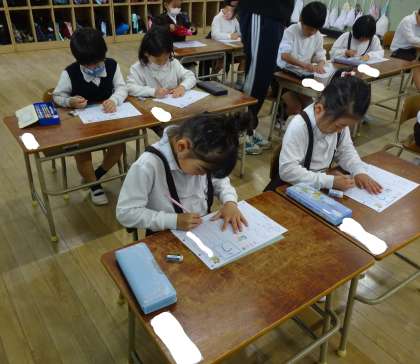 1年生は、国語科「あいうえおのうた」です。ひらがなの学習が始まっています。今日は、「う」の練習です。注意するポイントに気をつけながら、丁寧に練習していました。