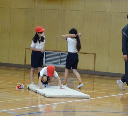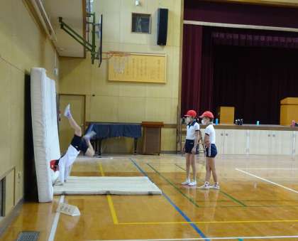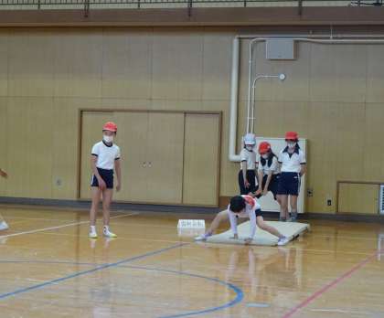 5年生は、体育科「マット運動」です。坂道、セーフティーマットなど、工夫された場で、様々な技に挑戦していました。