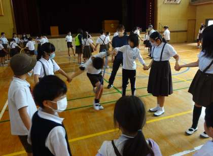 今日の児童集会は「フラフープくぐり」です。ワクニコ班で協力して、一人一人フラフープをくぐります。14周回すことができた2班が優勝しました!