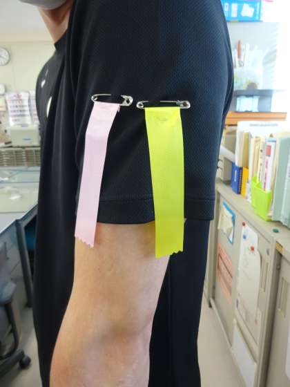 先日、お子さまを通して学年別のカラーリボンを各家庭4枚ずつ配布しております。カラーリボンが入場券の代わりとなります。当日、お忘れのないようにご準備ください。下の写真のように、左肩に在学のお子さまの数分着けてください。また、数に不足があるご家庭は、学校までご連絡いただけますようお願いします。追加分をお渡しします。
