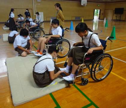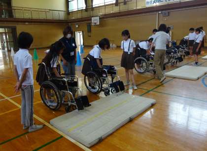 5年生は、総合的な学習の時間に福祉の学習をしています。これまで、インターネットや本で福祉について調べ学習をしてきました。今日は実際に車いすに乗ったり、押したりする体験をしました。