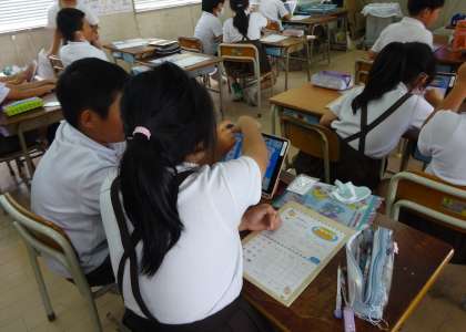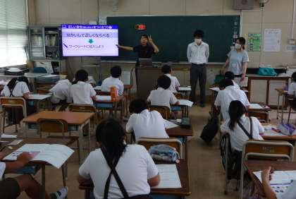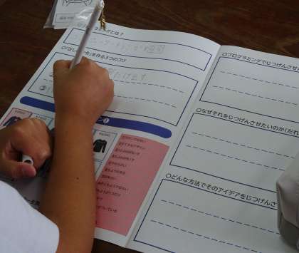 今日は3年生と5年生にプログラミングについての出前授業がありました。プログラミングとは何か?を学んだあと、実際にプログラミング的思考を使ってワークをしました。