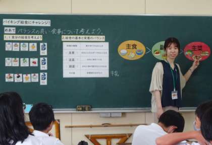 今日の栄養教育は、「バイキング給食にチャレンジ」です。主食・主菜・副菜を自分で考えて1食分の給食の献立を作ります。栄養のバランスだけでなく、主食>副菜>主菜の量の違いも教えていただきました。