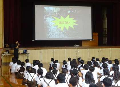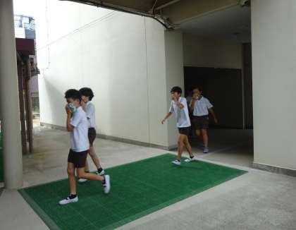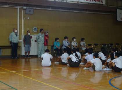 防災訓練をしました。生野区役所・生野消防署・地域の防災リーダーさんにもご協力いただきました。初めに、理科室からの火災を想定して避難訓練をしました。工事が始まってから初めての避難訓練です。その後、生野区役所の方のお話を聞いた後、各学年に分かれて、体験活動をしました。低・中学年は水消火器と煙幕テント、高学年は救命救急講習を受けました。