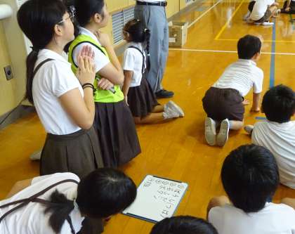 今日の集会は「まちがい探し」です。前に出てきた集会委員の様子が、2回目に出てきたときに少し変わっています。間違いは全部で4つです。ワクニコ班で協力して、違いを見つけていました。「ボタン」などとても細かい違いもあったのですが、さすが子どもたち。よく観察していました。