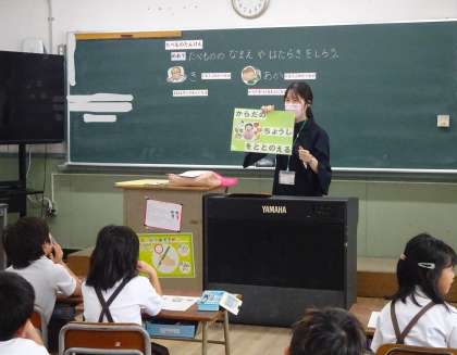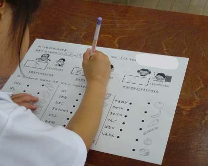 栄養教育がありました。今日は、「たべもののなまえとはたらき」について学習しました。食べ物はその働きによって、「あか」「き」「みどり」のグループに分けられることを知りました。