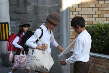 朝、鶴橋向上委員会のメンバーが正門前に募金箱をもって立っています。