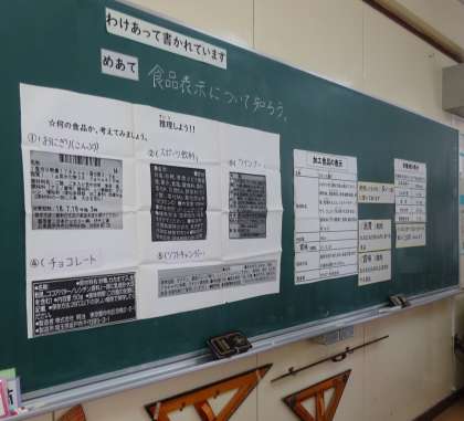 「食品表示」について学習しました。身の回りにある食品の食品表示を見て、何の食べ物についているものか、考えました。