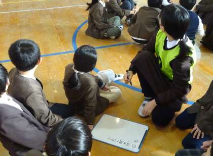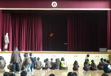 今日は、舞台上カーテンの間を飛んでいく(通る?)ものは何でしょうゲームでした。一瞬しか見ることができないので、みんな集中して見ていました。最後には、物ではなく、人が走り抜けていきました。