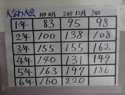 金曜日に引き続き大なわ大会です。今日は、2年生と4年生が参加しました。1回目の大会からの伸び率で優勝学年が決まります。あとは、6年生だけです。どの学年が優勝するでしょうか!!