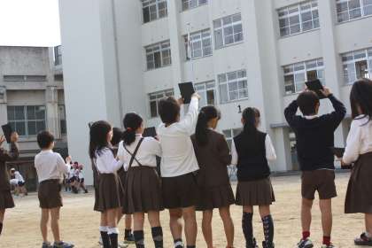 運動場に出て鏡で太陽の光を反射させました。