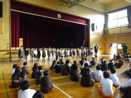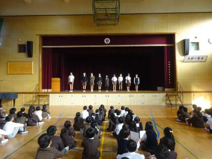 月初めの児童朝会では、毎月のデジタルドリルをがんばって進めた児童を表彰しています。