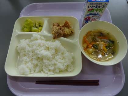 <鶏肉のたつたあげ 五目汁 キャベツの梅風味 ごはん 牛乳>