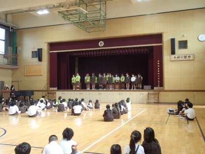 今日の児童集会では鶴橋向上委員会の紹介がありました。運営委員、学級代表、各委員長が自己紹介をして、抱負を伝えました。とても堂々としていていました。
