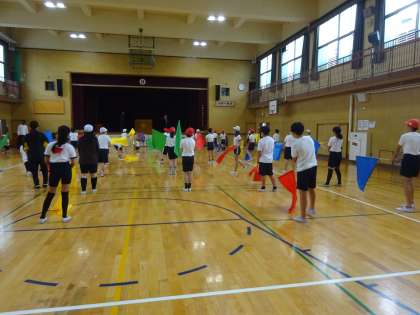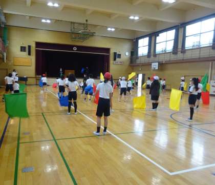 運動会の練習が始まりました。5・6年生はフラッグを使った演技に取り組んでいます。