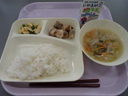 <さけのみそ焼き 五目汁 えんどうの卵とじ ごはん 牛乳>