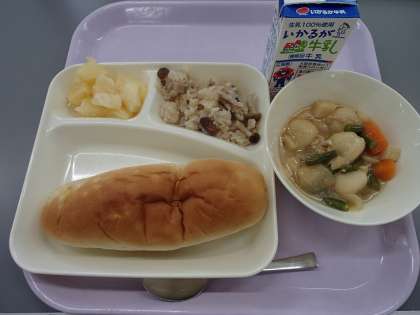 <金時豆の中華おこわ まる天と野菜のうま煮 パインアップル(カット缶) おさつパン 牛乳>