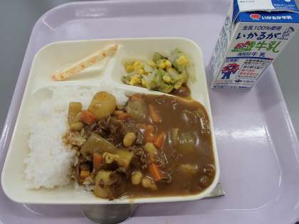 <牛肉と大豆のカレーライス レタスとコーンのサラダ 棒チーズ 牛乳>