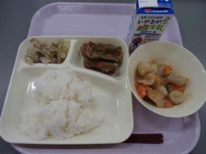 <ちくわのいそべあげ あつあげとさといものみそ煮 キャベツの赤じそあえ ごはん 牛乳>