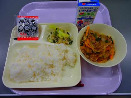 <マーボ−はるさめ チンゲンサイともやしの甘酢あえ いり黒豆 ごはん 牛乳>