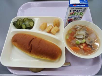 <いかてんぷら フレッシュトマトのスープ煮 きゅうりのバジル風味サラダ パンプキンパン 牛乳>