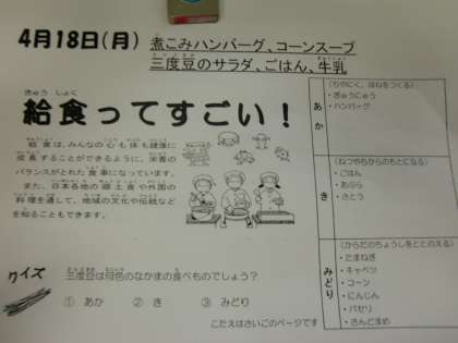 お昼の給食の時間になると、いつも給食委員さんが放送してくれます。今日の献立と献立にまつわる三択クイズです。教室では「1番!」「2番や!」「3番かな?」とクイズで盛り上がっています。