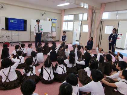 今日の3時間目は生野警察署のおまわりさんがやってきてくれました。知らない人に声をかけられたときはどうするのかな。おまわりさんに教えてもらったことは、忘れないようにしましょう。