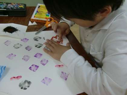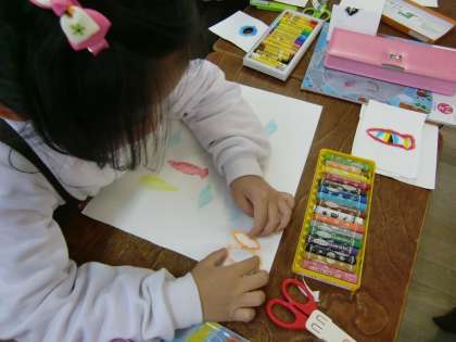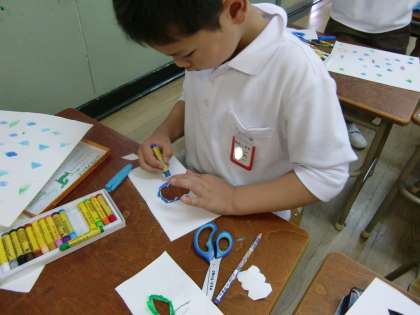 お気に入りの形に画用紙を切り、指で色をぬりひろげました。
