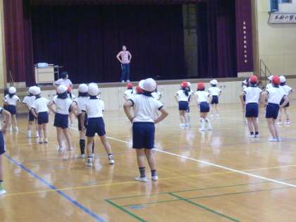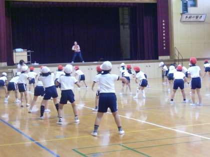 運動会のダンスの練習をしています。舞台の上で踊る先生の姿を見ながら、大きくのびのびと踊っています!1・2年生、心を一つに一生懸命練習しています!
