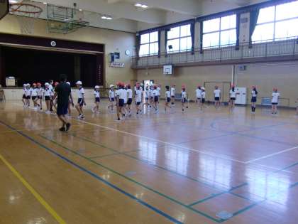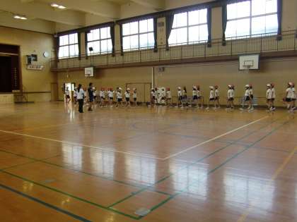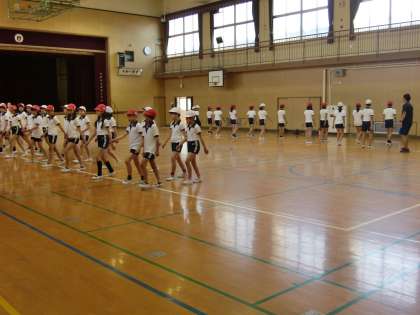 運動会で行う集団行動の練習です。「回れ右 いち、に、さん、し」「右向け右 いち、に」掛け声とともに歩く向きを変えていきます。列の交差や隊形の変化も練習しています。全員の足並みがビシッとそろうよう、心を合わせて頑張ります。