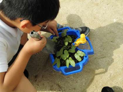 1年生は、一人ひとり、あさがおを育てています。元気に芽を出したあさがおを今日は学級園に植え替えました。みんなのあさがお大きくなあれ。
