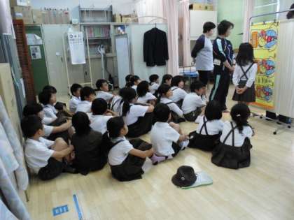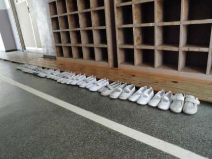 保健室の前にはぴったりときれいに並べられたうわぐつが。今日は歯科検診。保健室の中で、静かに順番を待っています。大きな口をあけて先生にみてもらいました。これからも食べた後はしっかり磨こうね。