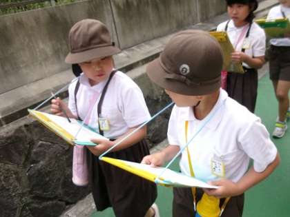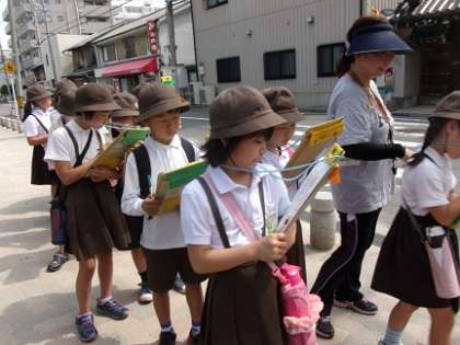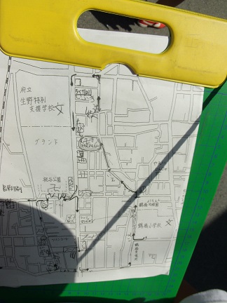 3年生は社会科の学習で桃谷の町はどのような町なのか、探検しに行きました。学習した地図記号も使って、病院や郵便局も地図にかきこんでいます。