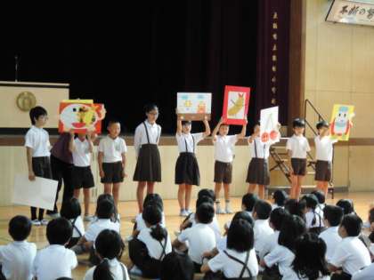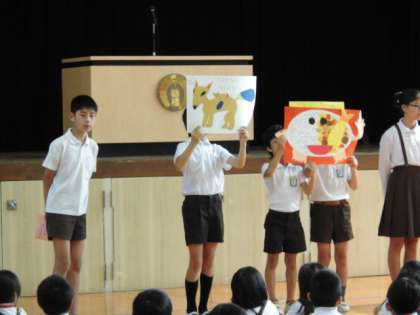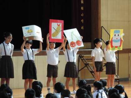 今日は、給食委員会が考えたキャラクターの発表がありました。