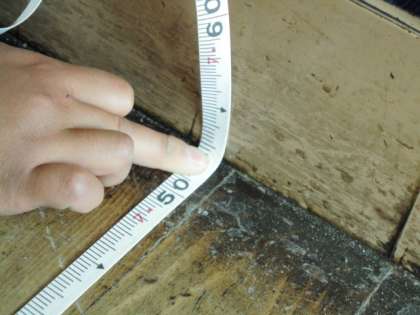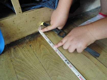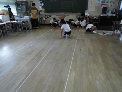 メジャーを使って、教室のたてと横の長さをはかりました。