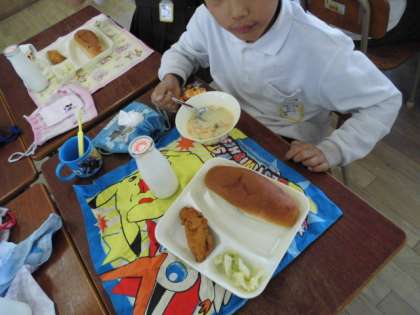 今日の給食の様子です。豆乳コーンスープにレーズンパン、キャベツのソテー、サーモンのフライ。どれもおいしいとにっこり笑顔の子どもたち。おしゃべりを楽しみつつ、給食も味わって食べていました。給食を食べた後は元気いっぱいに運動場で遊んでいました。