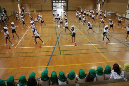 今日は、1・2年生が運動会で踊ったダンスを披露しました。