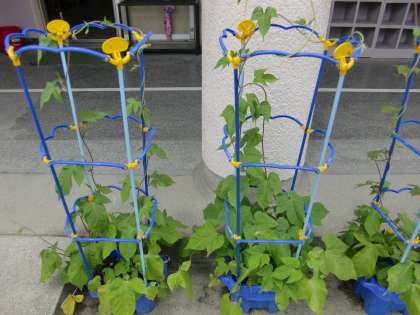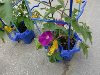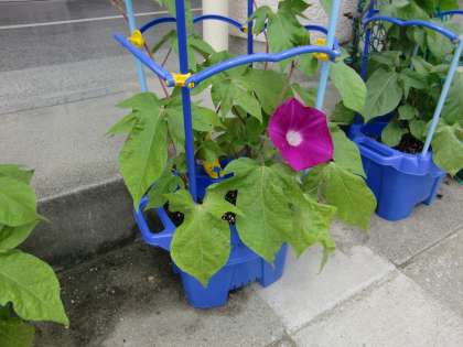 1年生が育てているあさがおが、咲きました。つるがぐんぐんのび、大輪の赤紫色の花が咲きました。とってもきれいです。1年生も大喜び。これから、いっぱい咲いていくのが楽しみです。