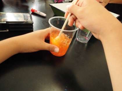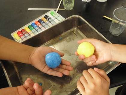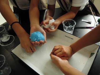 科学クラブでは「はずむスライム」を作りました。材料を入れて混ぜるとだんだんかたまりができてきました。それをギューッとしぼると丸い形になったよ!机の上でポーンポーンとはずむスライム!はずむスライム作り、成功です!