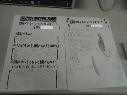 3年生は理科の学習の時間にパソコンを使って、自分の知りたいことについて調べました。「ひまわりの種の並び方に秘密はあるの?」「ツチノコっているの?」「夏の大三角って?」と、たくさんの疑問がでていました(^^)調べたこともメモしていました。