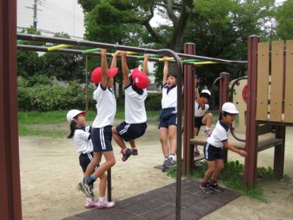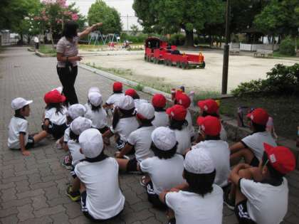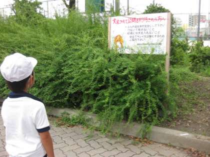 1年生は公園たんけんに行きました。公園にはどんなものがあるのかな。汽車やうんていなどの遊具だけではなく、公園の使い方がかいてある看板も見つけました。いつも遊んでいる公園。でも今日は新しい発見がたくさんありました。