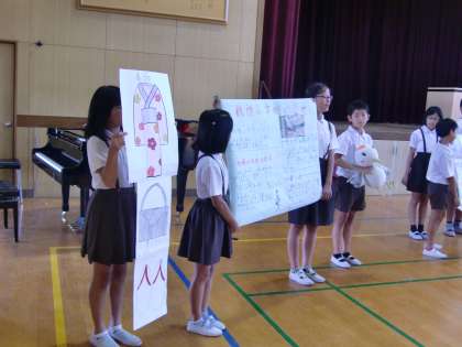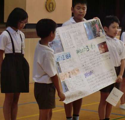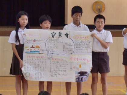 6年生は総合的な学習の時間に「ルーツを探ろう わが町」で地域に残る昔からあるものについて学習しました。フィールドワークやインタビューを通して分かったことを模造紙にまとめ発表しました。鶴橋小学校や御幸森神社、安泉寺について、その歴史や地域とのつながりなどを学び、これらが地域の人に大切に守られていることが分かりました。