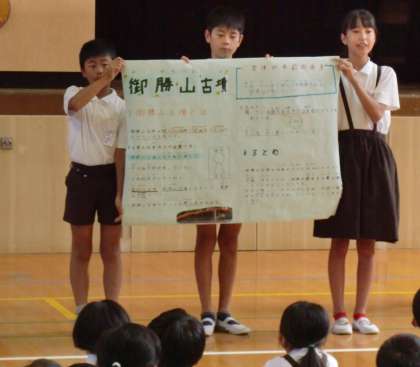 御勝山古墳、つるのはし跡、コリアタウンについても調べました。どれにも歴史があり深く地域の人とつながっていることが分かりました。最後に6年生は、「私たちの地域にあるものは過去から現在に至るまで地域の人に大切にされ、愛され続けています。これからも私たちは地域の人の思いを受け継いで、大切にしていきたいと思います。」と、素敵な言葉でみんなに伝えることができました。