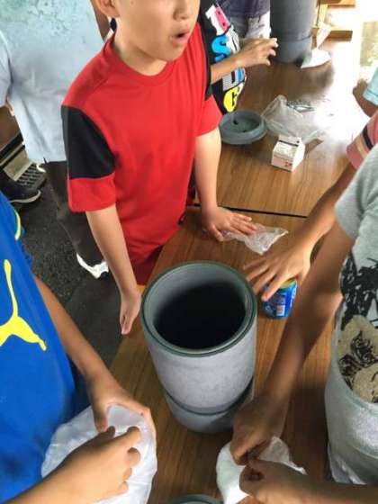 アイスクリーム作りをしています。砂糖と塩を間違えないでね。