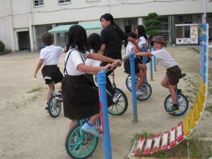 さっそく、実習生の先生と一緒に一輪車で遊びました!!